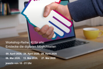 24.04.2026 @ 18:00 - 21:00 - KI für alle: „Entdecke die digitalen Möglichkeiten“ Diese Workshopreihe (6 Termine, je 3 Std., Blended Learning) bietet einen praxisnahen Einstieg in Künstliche Intelligenz und digitale Alltagsanwendungen. Die Teilnehmer_innen lernen, wie KI-gestützte Tools im Beruf, in der Gesundheit oder beim Reisen sinnvoll unterstützen können – etwa durch Sprachassistenten, Navigations-Apps, Copilot, ChatGPT oder smarte Produktivitätstools. Auch digitale [...]