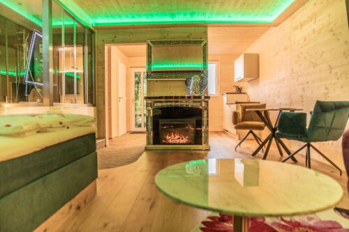 mit romantischem Kamin (elektrisch), Whirlpool inkl. Dampfdusche für Zwei, Kingsize Bett und direktem Zugang zur eigenen Terrasse mit Gartenanteil (Terrasse + Garten Fertigstellung Frühjahr 2025). Das Apartment befindet sich im Erdgeschoß.